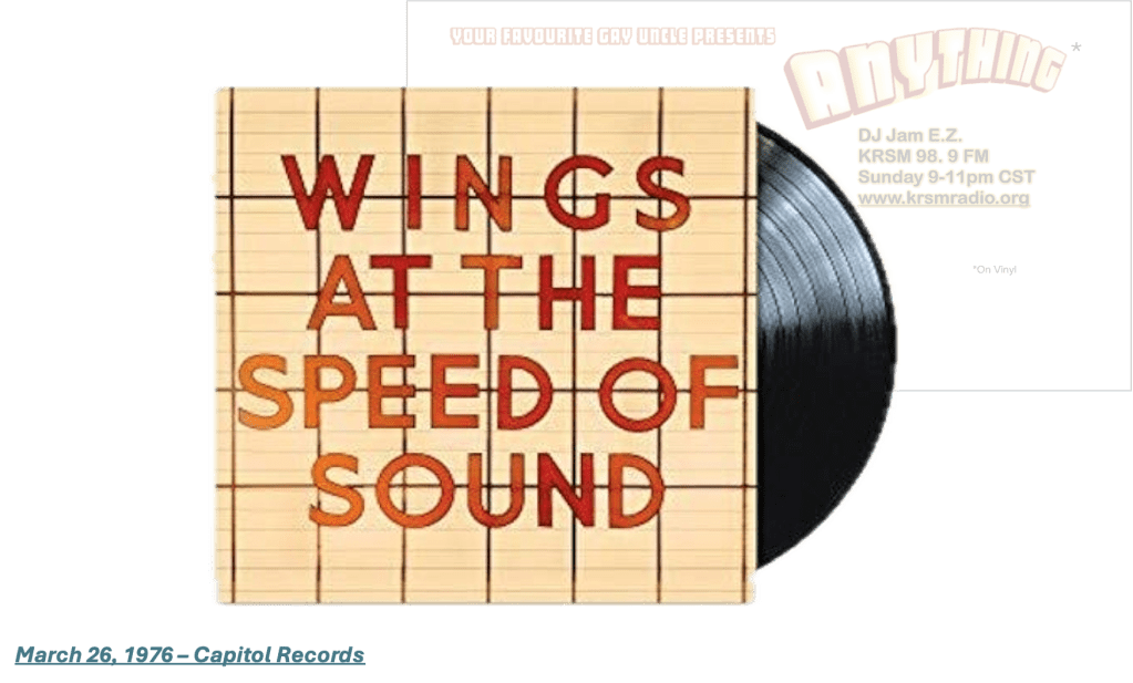 I just put on Wings At The Speed of Sound for the first time. Delightedly shocked to hear it open with this song I love so much. Content to hear it on the radio now and again, I never sought it out. I’m sure my anti-Beatle bias also deterred me from opening up to Wings. Happy to correct that (Mind you, “Arrow Through Me” by Wings, is also a favourite acquired via castoff of Back To The Egg.).