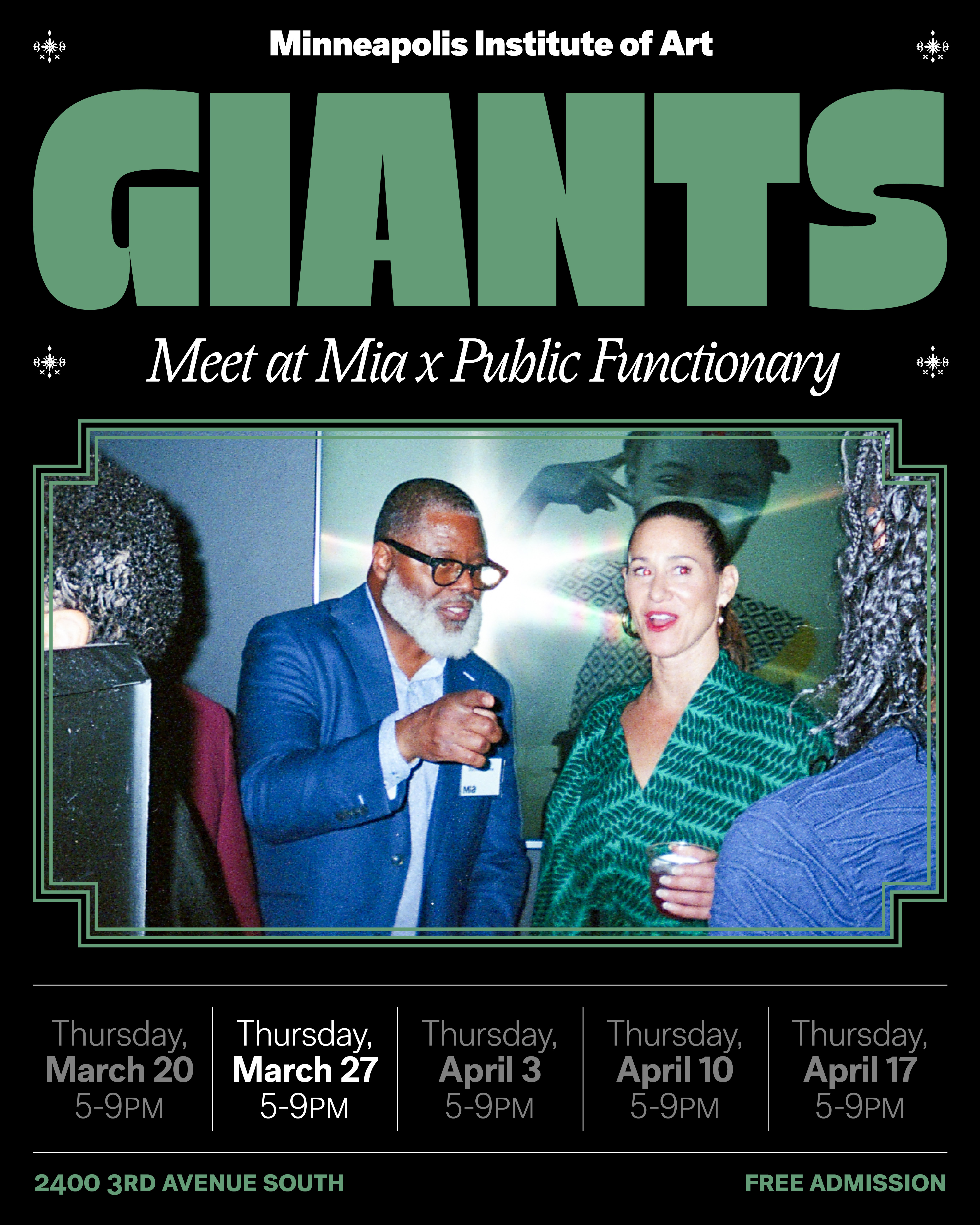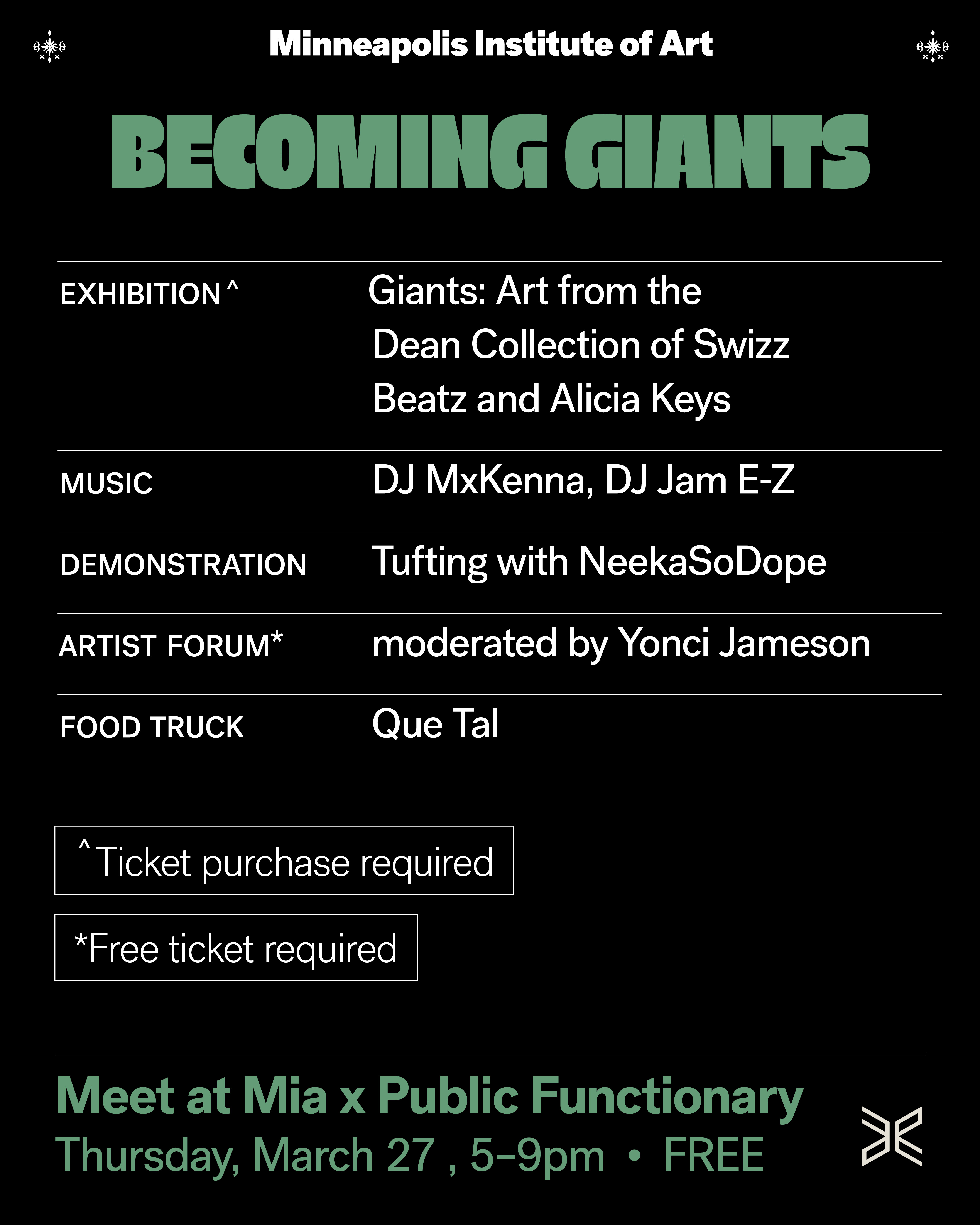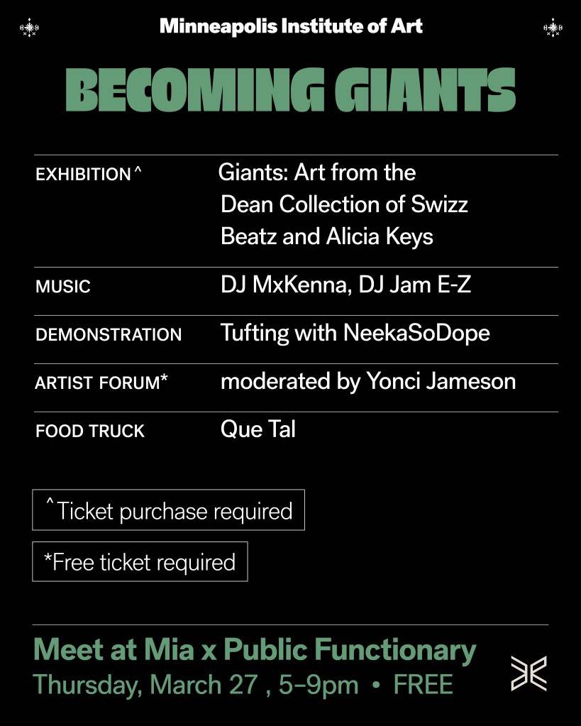 Meet at Mia x PF programming kicked off last Thursday with dialog, music, dancing, and community. Ticket price for the exhibition of the Dean Collection of Swizz Beatz & Alicia Keys is $20. Check the MIA website for more info.